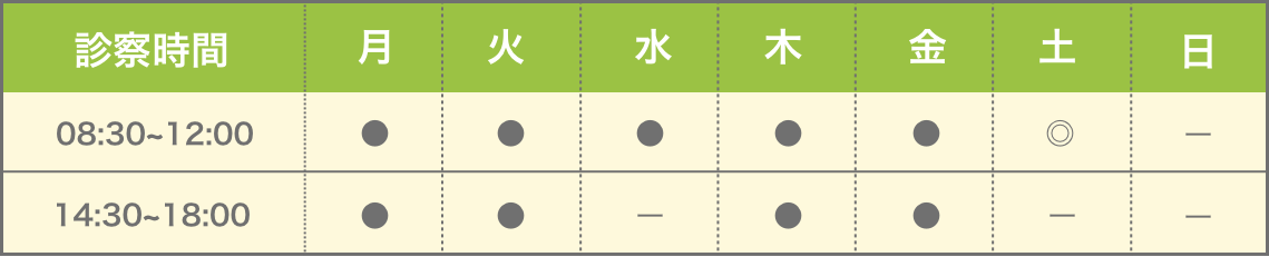 | 14:30〜18:00 | ● | ● | - | ● | ● | - | - |